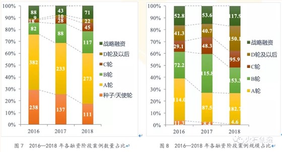 從融資階段看,投資更趨向后期階段集中。2018年,B輪及以后融資項目數(shù)量共255起,占全年融資項目比重的39.9%,比2017年上升了10%,比2016年上升15.9%,投資趨勢與前兩年相比,更往后期階段集中。早期融資項目數(shù)量明顯較少,表明資本對于醫(yī)療健康產(chǎn)業(yè)前期的創(chuàng)新投資越加謹(jǐn)慎。