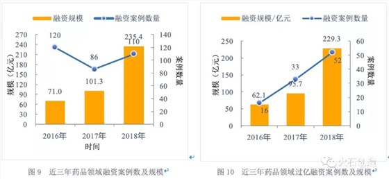 受行業(yè)利好政策影響,2018年創(chuàng)新藥資本吸引能力顯著提升。全年累計完成融資案例數(shù)達110起,占全年融資案例總數(shù)的17%;披露融資規(guī)模約235.4億元,占全年融資規(guī)模的33.4%。