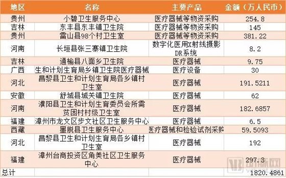 動脈網(wǎng)查詢了近半年來的基層醫(yī)療衛(wèi)生機構(gòu)招標公告發(fā)現(xiàn),13家基層醫(yī)療機構(gòu)在半年內(nèi)的醫(yī)療器械采購額約1894萬元。其中一級醫(yī)院的采購額基本在100萬-300萬元之間,社區(qū)衛(wèi)生服務(wù)中心購買能力更弱一些。