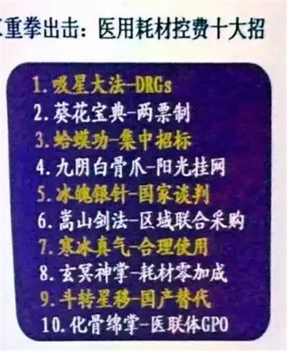 醫(yī)用耗材控費(fèi)十大招:DRGS,兩票制,集中招標(biāo),陽(yáng)光掛網(wǎng),國(guó)家談判,區(qū)域聯(lián)合采購(gòu),合理使用,耗材零加成,國(guó)產(chǎn)替代,醫(yī)聯(lián)體GPO。這十大招好厲害。