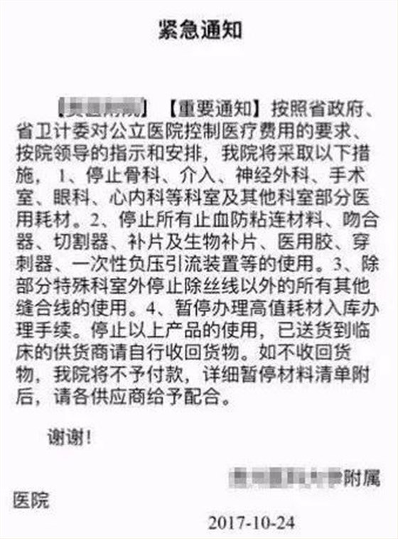 ▼網(wǎng)上流傳的貴州某醫(yī)院停用耗材的通知。