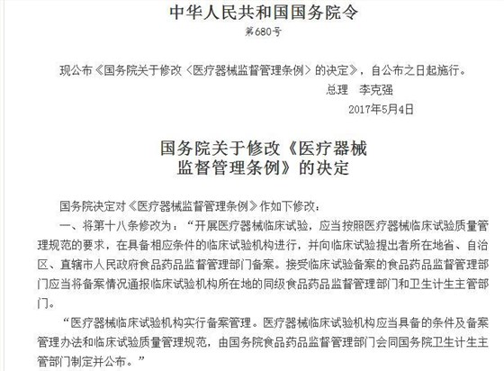 2017年5月4日國務院公布了最新《醫(yī)療器械監(jiān)督管理條例》,相較之前條例,主要做了四大調整